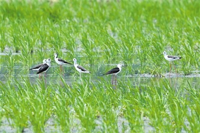 近日,记者在匡堰镇倡隆村的稻田里看到一群鸟界“超模”——黑翅长脚鹬。“超模”们在稻田里时而嬉戏、时而觅食,惬意地享受田园生活。摄影 全媒体记者 王烨江 通讯员 陈颖俊