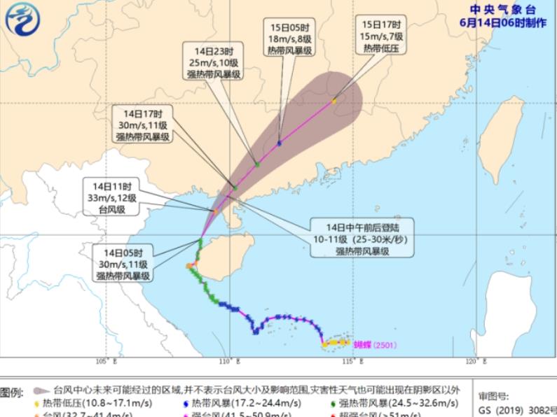 台风登陆消息:今年第1号台风“蝴蝶”的中心已于6月13日晚上11点前后在海南省东方市沿海登陆,登陆时减弱为强热带风暴级,中心附近最大风力11级(30米/秒),中心最低气压980百帕。